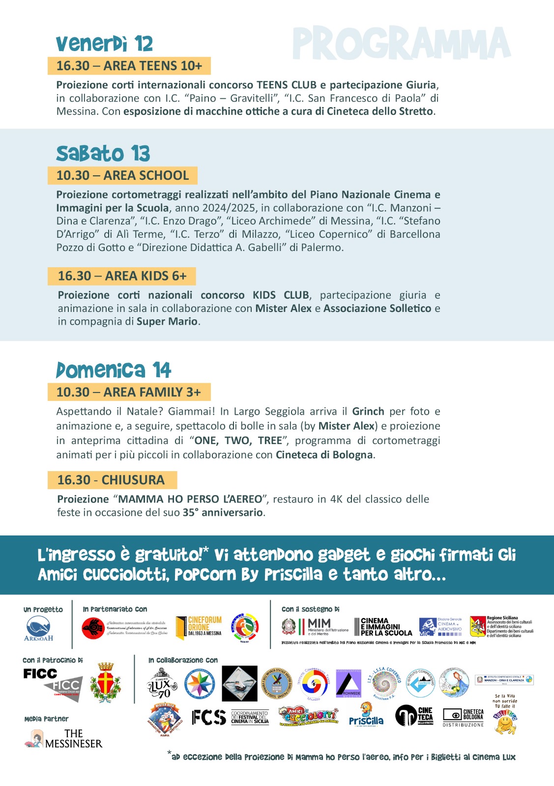 L’apertura è fissata per venerdì 12 dicembre alle 16.30 con l’Area Teens 10+, che ospiterà la proiezione dei cortometraggi internazionali in concorso TEENS CLUB, con la partecipazione della giuria composta dagli studenti degli istituti “I.C. Pajno – Gravitelli” e “I.C. San Francesco di Paola” di Messina. A completare l’esperienza, un’esposizione di macchine ottiche a cura della Cineteca dello Stretto.