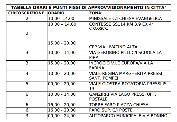 Il Comune ha reso noti gli orari e le localizzazioni delle postazioni fisse per l’approvvigionamento idrico in città.