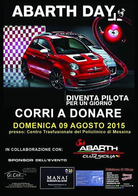 Diventa pilota per un giorno. Corri a donare! È il monito lanciato dall’Abarth Club Sicilia, che domenica 9 agosto parteciperà ad una giornata promossa presso il policlinico di Messina per dire sì alla donazione di sangue.