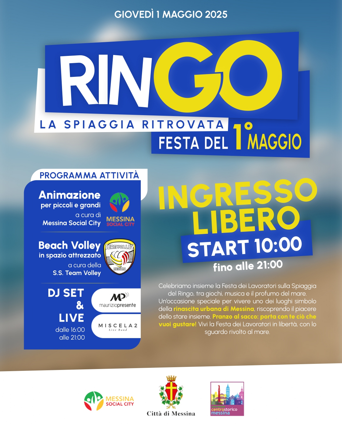 Quest’anno il Primo Maggio si festeggia alla spiaggia del Ringo di Messina. La Giunta guidata dal sindaco Federico Basile prosegue l’attività di valorizzazione della spiaggia del Ringo e, infatti, l’Amministrazione comunale ha deciso di organizzare in compartecipazione con l’Associazione Centro Storico un’iniziativa che intende offrire ai cittadini l’opportunità di celebrare insieme il Primo Maggio, Festa dei Lavoratori, proprio nella spiaggia del Ringo.