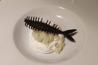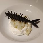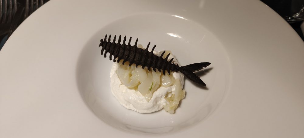 Tagliatelle di seppia al lime, spuma di burrata e chips di nero di seppia