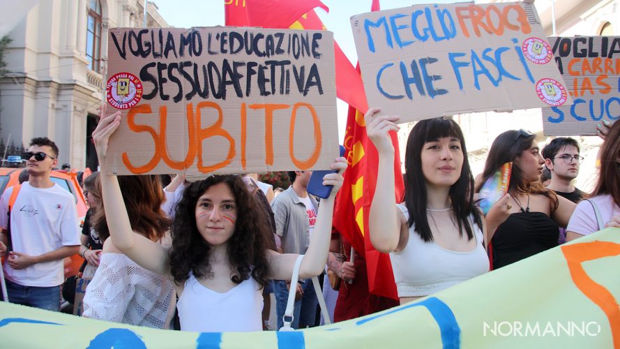 Il primo intervento, a pochi metri dal polo centrale dell’Università di Messina, è stato quello di Greta Grasso dell’UDU (Unione degli universitari): «È un onore essere qui, vedo tanti volti sorridenti, ma so che c’è anche tanta rabbia. Quei politici che definiscono il Pride una carnevalata sono quelli che non ci rappresentano e non ci rappresenteranno mai. Lo Stato ad oggi non tutela il benessere dei cittadini, non tutela la pace, non tutela le categorie più fragili. Viviamo in un’epoca in cui l’odio, la violenza, la censura sono tutelate meglio dei diritti della persona umana. In quanto persona e donna queer oggi sono qui per denunciare un fenomeno sistemico di cui non si parla abbastanza. Le università italiane non sono dei luoghi sicuri. Abbiamo diritto ad avere presidi antiviolenza in tutti i poli di tutti gli atenei, abbiamo diritto a non aver paura di denunciare perché ne temiamo le ripercussioni». La studentessa ha quindi ricordato il femminicidio di Sara Campanella avvenuto a Messina il 31 marzo 2025: «Sara Campanella non è un banale numero in una statistica Istat, Sara Campanella è l’ennesima vittima di un sistema patriarcale che preferisce mandare le proprie figlie a morire piuttosto che educare i nostri figli. Per tutte le sorelle che ci sono state strappare, vi chiediamo di fare rumore. Facciamoci sentire, il sistema deve cambiare. Non siamo indifferenti e mai lo saremo».