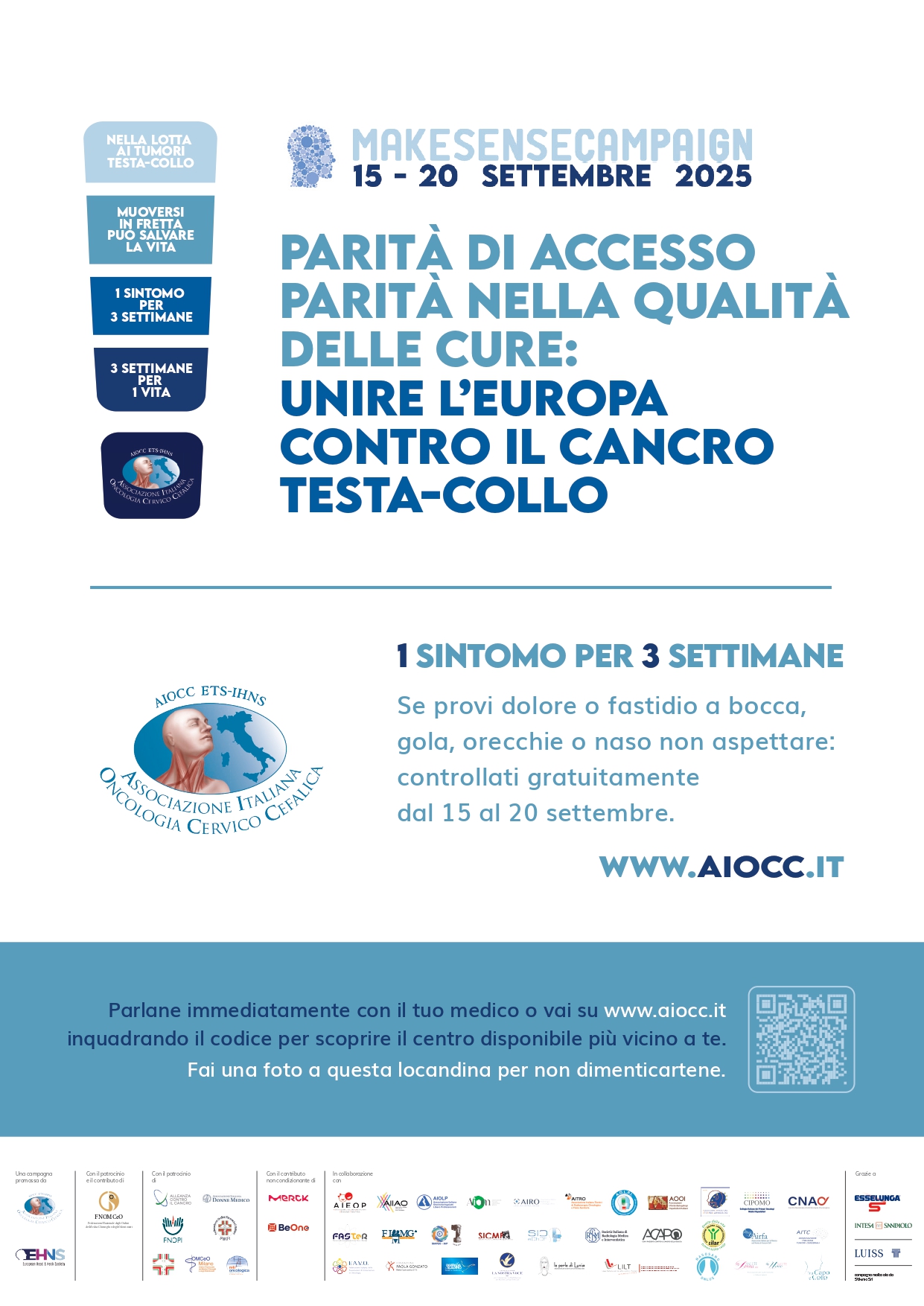 I tumori testa-collo si possono contrastare con la prevenzione e l’informazione. Anche l’unità operativa complessa (UOC) di Otorinolaringoiatria dell’AOU G. Martino di Messina, diretta dal Prof. Francesco Galletti, aderisce alla campagna “Make Sense”, promossa dalla Società Europea dei Tumori Testa Collo (European Head and Neck Society, EHNS). L’obiettivo è di accrescere la consapevolezza sui sintomi legati ai tumori della testa e del collo. In Italia la campagna è portata avanti dall’Associazione Italiana di Oncologia Cervico-Cefalica ETS (AIOCC) con l’intento di intercettare possibili disturbi ed effettuare diagnosi precoci.