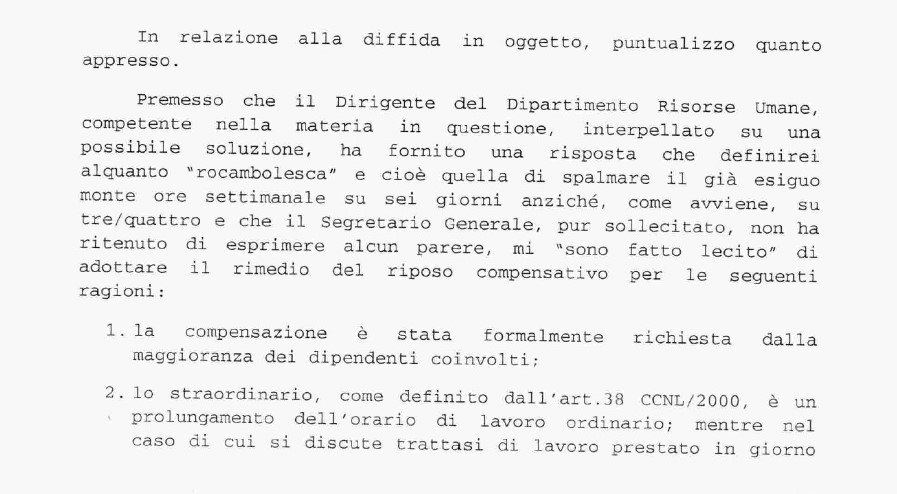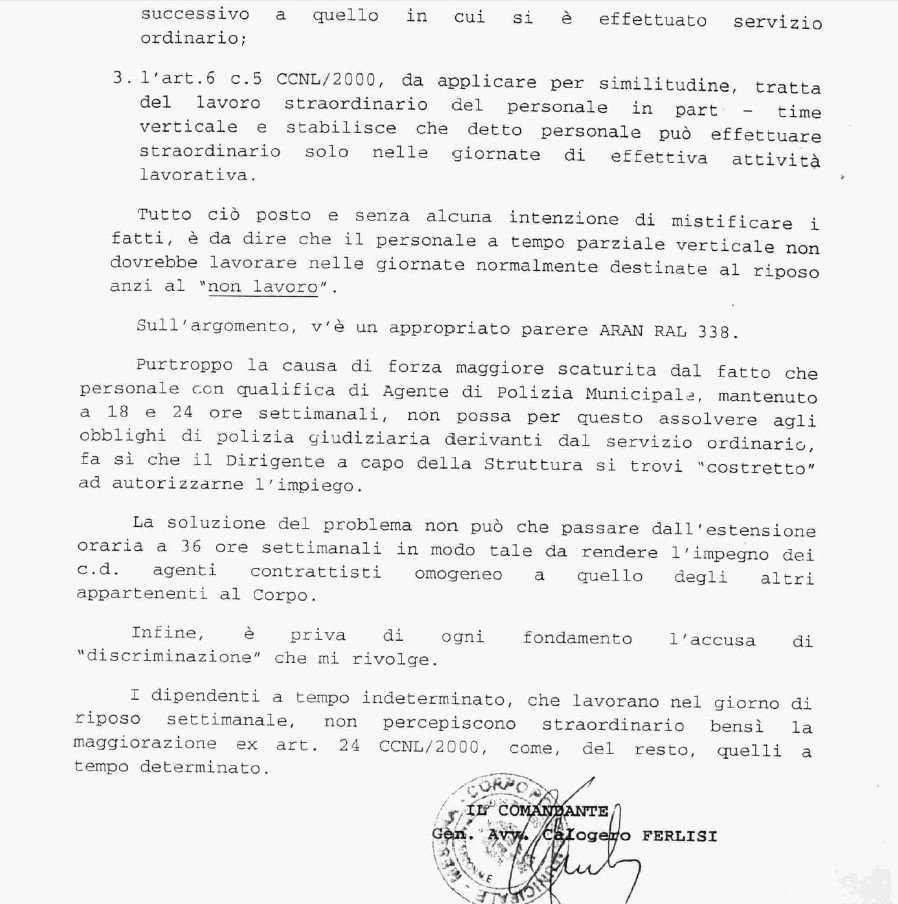 Con una nota di diffida inviata lo scorso 16 novembre, il coordinatore provinciale del Csa Pietro Fotia aveva puntato il dito contro il provvedimento del Comandante dei Vigili Urbani Calogero Ferlisi che istituiva il riposo compensativo per i i dipendenti della polizia municipale, invece di garantire il pagamento del lavoro straordinario svolto nelle giornate di riposo. E questa mattina è arrivata la risposta di Calogero Ferlisi che chiarisce i contorni dell’azione intrapresa e contestata dal sindacato. Di seguito la nota di risposta del Comandante della Polizia Municipale: