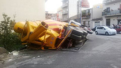 Una betoniera è stata, letteralmente, inghiottita dalla strada. Erano circa le nove di questa mattina, a Barcellona ( zona Oreto) quando il pesante mezzo è precipitato dentro una profonda buca che si è spalancata sull’asfalto. La betoniera si è adagiata sul fianco sinistro.