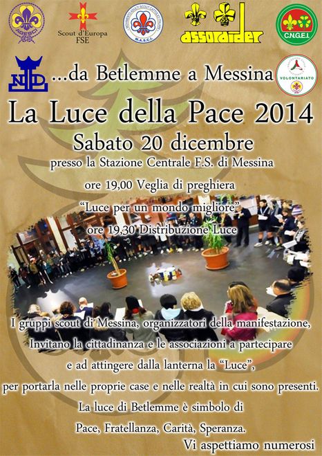 Anche quest’anno, in preparazione al Santo Natale, i vari movimenti scout di Messina accoglieranno in riva allo Stretto la Luce della Pace proveniente direttamente da Betlemme. La fiamma perenne giungerà sabato, alle 19.30, alla Stazione Marittima da un treno proveniente da Trieste. Ad accoglierla, dopo una veglia di preghiera, saranno gli scout di Messina. La fiamma accesa sarà consegnata dagli scout triestini ai vari gruppi e comunità che la distribuiranno a loro volta nelle proprie parrocchie.