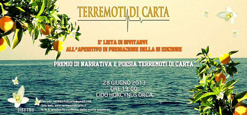 In dirittura d’arrivo la stagione dell’Associazione Culturale “Terremoti di Carta”, che chiude la sua attività, prima della pausa estiva, con il consueto appuntamento del Premio Letterario di Narrativa e Poesia. La III edizione ha avuto come protagonista il mare e sul mare si terrà l’aperitivo di premiazione dei migliori elaborati valutati da una giuria. L’appuntamento è il 28 Giugno, alle 19.00, al Lido Horcynus Orca (Messina), per festeggiare insieme il percorso che sta volgendo al termine. Nuove “scosse di terremoto” aspettano tutti a Settembre, con ricche e interessanti proposte.