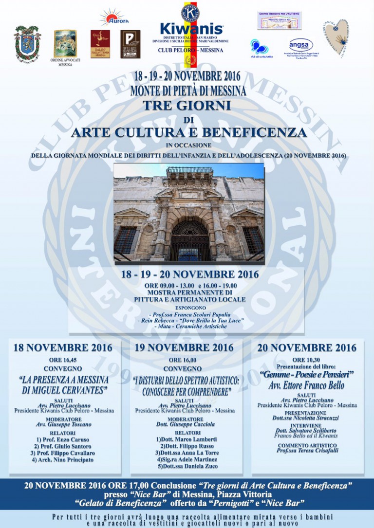 Il Kiwanis Club Peloro Messina, organizza una "Tre giorni di Arte Cultura e Beneficenza" che si terrà nei giorni 18, 19 e 20 Novembre 2016 presso i locali del Monte di Pietà , in occasione della Giornata Internazionale dei diritti…