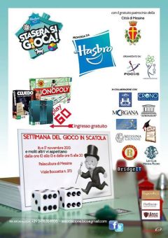 gioco in scatolaAnche quest’anno Messina parteciperà alla terza edizione della “Settimana del gioco in scatola”, iniziativa promossa dalla Hasbro, azienda leader dei giochi in scatola, con il patrocinio gratuito del Comune, che si svolgerà in contemporanea con altre 50 città d’Italia. L’obiettivo è di riscoprire la voglia di stare insieme giocando ed incoronare la “Città del gioco 2013”. Grazie al supporto organizzativo delle associazioni Bios e Focus, in collaborazione con le associazioni Noema, Crono, Villafranca Giovane, Morgana, Credito Accademico, BridgeIt, Messina Giovane, Athenaeum, Leo Club Messina Peloro e Rotaract Club Messina, la manifestazione si svolgerà al Palacultura, sabato 16 e domenica 17, a partire dalle ore 10 e sino alle 20. Nel corso delle due giornate, i partecipanti avranno la possibilità di intrattenersi con numerosi giochi da tavolo messi a disposizione gratuitamente dalla Hasbro, e bambini, giovani e adulti potranno gareggiare a Monopoly, Indovina chi?, Trivial Purshuit, Taboo, Cluedo e tanti altri. Tutti i giocatori saranno in competizione con i residenti di altri 50 Comuni italiani per conquistare il titolo di “Città del Gioco 2013”, che sarà assegnato a chi accumulerà il maggior numero di ore di gioco a livello nazionale. In tutta la Sicilia, oltre alla città di Messina, soltanto Palermo e Misterbianco parteciperanno all’iniziativa. A conclusione della manifestazione la Hasbro premierà la città più “giocosa” dotandola della ludoteca più grande d’Italia che verrà allestita nel Comune vincitore grazie a centinaia di giochi in scatola messi a disposizione di tutti i bambini, ragazzi e famiglie della città.