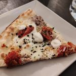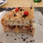 - Primo atto: Il bacio di Cariddi – “Sua Maestà la Braciola” (provola dei Nebrodi e fiordilatte, datterino rosso semisecco, petali di lacerto di manzo scottato, cipolla rossa caramellata, crumble di pane profumato, polvere di olive, maionese al limone home made. Impasto: 100 ore);