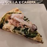 - Terzo atto: Il ponte che non c’è (provola dei Nebrodi, scarola saltata con pinoli e uvetta sultanina ammollata nella Malvasia delle Lipari, filetto di tonno, velo di lardo di Suino Nero dei Nebrodi. Impasto: Duomo);