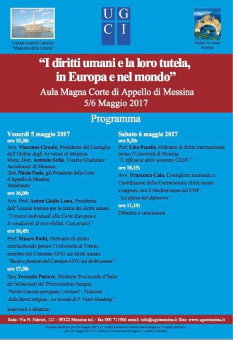 Si svolgerà, il 5 e il 6 maggio, nell'Aula Magna della Corte D'Appello di Messina, il Convegno "I Diritti Umani e la loro tutela, in Europa e nel Mondo". L'evento, organizzato dalla sezione di Messina dell'Unione Giuristi Cattolici Italiani con…