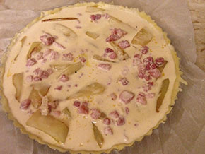 In una ciotola sbattete le uova , incorporate la panna,la pancetta, il parmigiano il sale ed il pepe. |