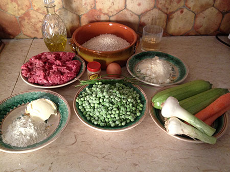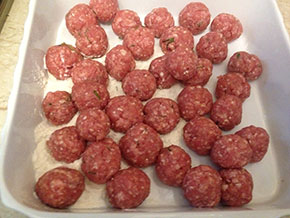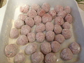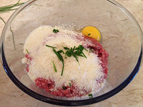 | In una ciotola mescolate la carne con l’uovo, il parmigiano,l’erba cipollina sminuzzata il sale ed il pepe. Formate delle piccole polpette che passerete nella farina . |