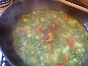 | Rosolate in una padella tutte le verdure tagliate a dadini ed i cipollotti tagliati a fettine sottili con qualche cucchiaio di olio. Aggiungete un bicchiere di acqua e proseguite la cottura a fuoco basso per circa 10 m. Aggiungete il curry e ultimate la cottura. |