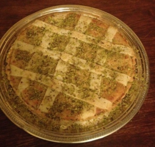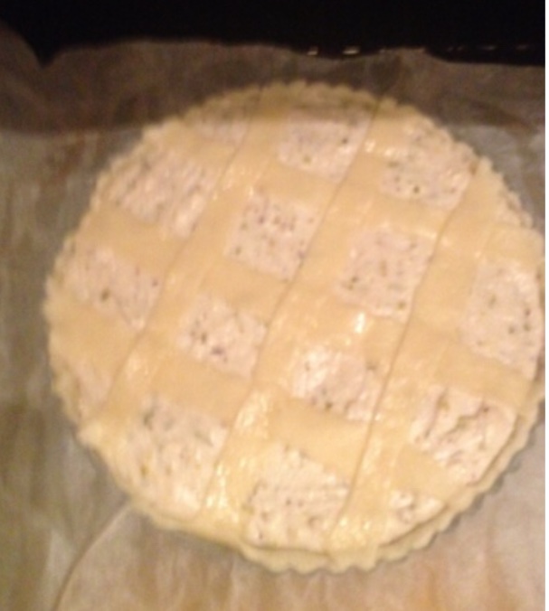 La farina, lo zucchero,la cannella, i pistacchi, il tuorlo ed il pizzico di sale, e stenderla sulla frolla.