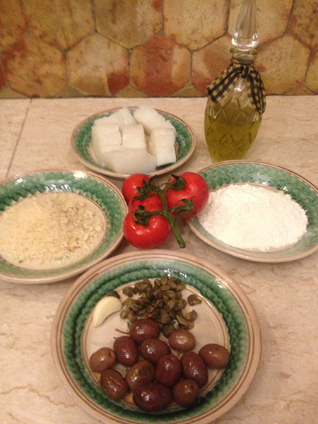 Adagiate i filetti di baccalà in una teglia da forno, conditelo con i filetti di pomodoro, le olive denocciolate, i capperi ed il pangrattato.
