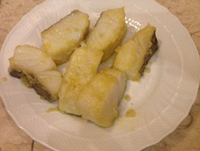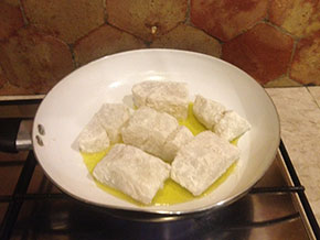 Infarinate i filetti di baccalà e soffriggeteli in padella con un cucchiaio di olio per un paio di minuti. Toglieteli dal fuoco e tenetelo da parte. |