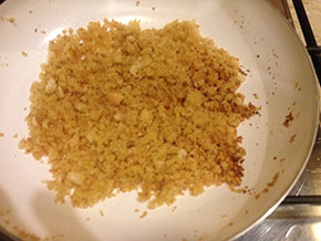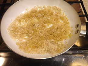 Fare rosolare in una padella il pangrattato con l’aglio con un cucchiaio di olio, e tenetelo da parte. |