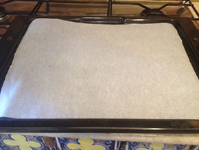 | Rivestite con carta da forno una teglia. Accendete il forno a 180 gradi. |