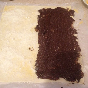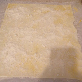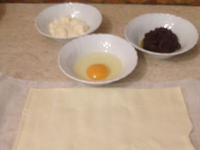 | Srotolate su di un piano la pasta sfoglia e preparate gli ingredienti. Segnate una divisione verticale sulla sfoglia, spennellatela tutta con l’uovo sbattuto, (lasciandone un po’ per la parte finale) poi aggiungete il parmigiano grattugiato, e solo su una delle due metà il paté di olive. |