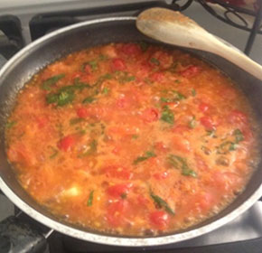 Mettete l’aglio in una padella con l’olio,e fatelo rosolare,aggiungete la polpa dei pomodori.