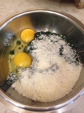 Mescolateli con le uova ed il parmigiano e aggiustate di sale e pepe (questa sarà la farcia della tasca). |