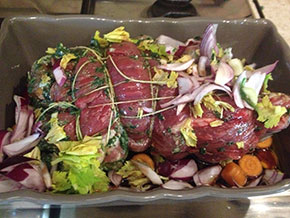 A questo punto unite le verdure, sedano, carota e cipolla, e bagnate con il vino rosso, proseguite la cottura in forno a 180 gradi per circa 60 minuti.