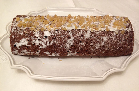 Montate la panna con la restante parte di zucchero a velo, con una parte dello zenzero tritato e spalmate il tutto sulla base del tronchetto.