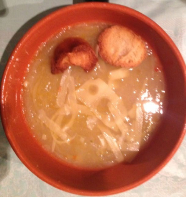 Zuppa delicata di cipolle con crostini croccanti di pane